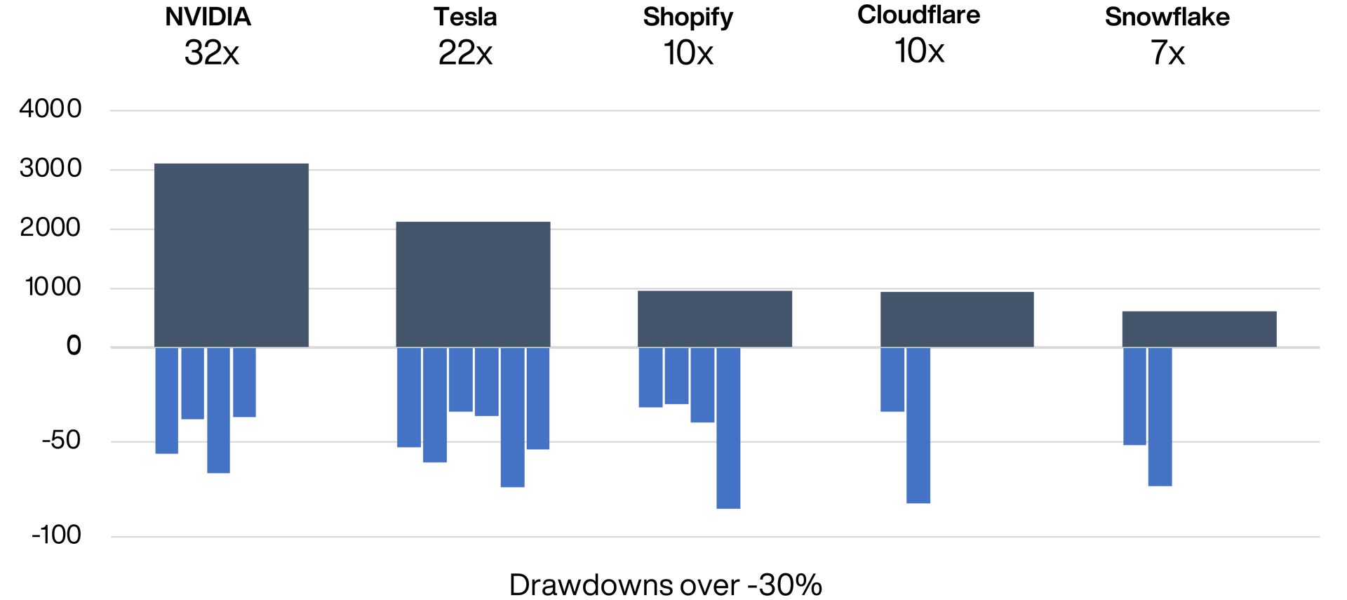 Source: Revolution. Holding period returns and drawdowns since inception (23 March 2018 to 30 June 2025). US dollar. Based on selected public stocks from the US Growth Trust. Snowflake drawdowns shown from IPO in 2020.