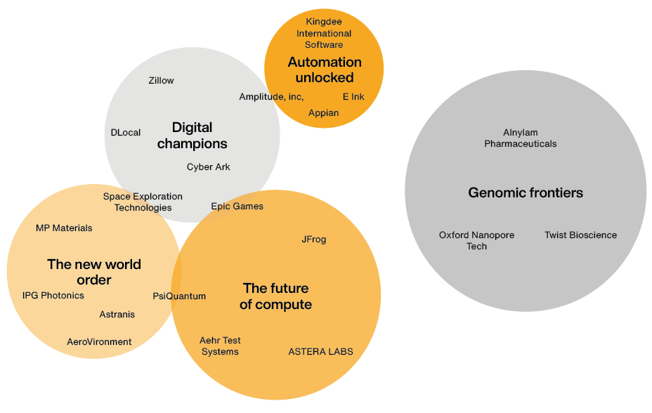 - Genomic frontiers. Advances in understanding of biology, particularly genetics, are ushering in a new wave of treatments and diagnostics that will transform the patient experience and address a profound societal need. Alnylam demonstrates that deep scientific expertise can alter the odds of drug discovery and approval. Twist Biosciences unlocks new opportunities for research and commercialisation by pushing the limits of DNA synthesis.